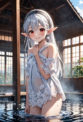 , embroidered with white vine-like lace, with sleeves and brilliant sequins, white unserwear, with big white brooch)),((best detailed red Eyes with eyeshadow:1.5 and reflection)), (messy platinum white long hair),elf ear with big red earrings ,wetting face,tilt,cheek,blush,enough lip with lipstick and wet,Skin Gloss and skin is soaking wet, wet-lip:1.5,big hip,small breasts,Skin Gloss at legs,looking at viewer,smile,mouth wide open, wearing head band of rose, BREAK,school building,very strong wind,Red spider lily farm, pixiv-chan,A sign reading “pixiv”, <lora:hohoaka:1> <lora:make25d_type1_v100:1>
