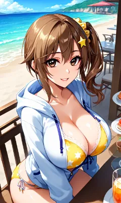 ultra detailed, top quality, masterpiece, aesthetic, high-res, absurdness, 16k, score_9, score_8_up, score_7_up, beautiful face, beautiful eyes, cute eyes, shiny hair, (4fingers:0.7), 1girl, voluptuous body, large breasts, sayuri, black hair, wavy hair, yellow green eyes, 2mole under eye, <lora:sayuri:0.6>, under boobs, lace lingerie, golden lingerie, rose print, back side, looking back, beach, in resort area, add more details, <lora:Add_more_details_pony:0.4>