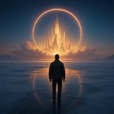 静かな湖畔の町で、旅人は星空の下に佇む。輝く天の川が湖面に映り、まるで宇宙の川が地上に流れ込むよう。遠くの山影が守るように囲み、町の灯りが優しく揺れる。ここで出会った恋人との約束を思い出し、旅人は新たな冒険を胸に誓う。夜風が囁くように、星々が語りかける運命の物語。