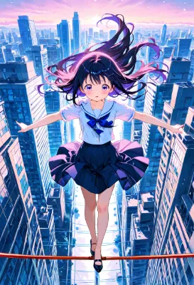 masterpiece, highres, absurdres, 8k, ultra-detailed, gochuumon wa usagi desu ka? style, pretty art, (detailed face:1.3), (cute face:1.2), (beautiful detailed eyes:1.3), pretty eyes, clearly defined eyes, (detailed hair:1.2), (beautiful detailed skin:1.2), (extremely detailed clothes:1.3), pastel colors, colored lineart, colored outline, multiple colorful stardust, full body, (high angle:1.3), 1loli girl, black hair, long hair, twintails, light-green eyes, in school uniform, navy thighhighs, high heels, (wears large high heels:1.3), (walking:1.2), (leaning_back:1.3), (arms spread wide:1.2), flying sweatdrops, slightly parted lips, looking at own feet, indoors, bedroom, on floor, bright,