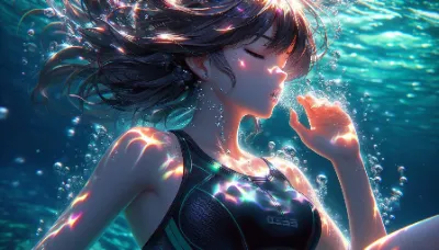A close-up anime-style image of a girl of Asian descent lying on the sea floor next to a coral reef. She appears unable to hold her breath, with her eyes closed and small bubbles escaping from her slightly parted lips. Her long hair, styled in a ponytail, floats around her. She wears a sleek, competitive sleeveless metallic white swimsuit. The vibrant underwater environment includes colorful coral reefs and dappled light patterns reflecting off her skin. Best Quality.