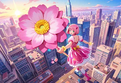賑やかな街の通りで、ピンクの髪をなびかせた少女が魔法のステッキを振り上げる。彼女の冒険は、日常の街並みを花畑に変えるもの。花びらが舞う中、少女は高くジャンプし、笑顔で街の人々に希望を届ける。どんな脅威が迫ろうとも、彼女の魔法は優しさで世界を彩る。あなたもこの瞬間を想像してみては?