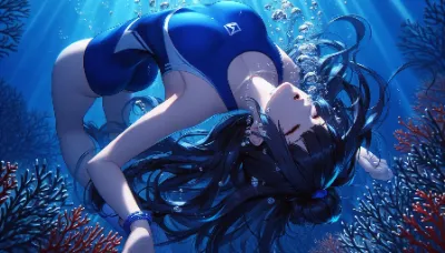 Detailed anime-style image of a girl of Asian descent unable to hold her breath while swimming at the bottom of the Coral Sea. She is wearing a sleek competitive sleeveless deep lue swimsuit and has short, flowing black hair with high ponytail. She appears to be exhaling or struggling underwater, with many air bubbles escaping from her mouth. The underwater scene is filled with vibrant light patterns from the sun, colorful fish. She closes eyes.She is completely upside down.