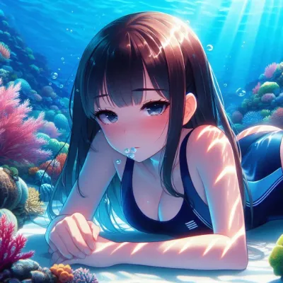 Anime-style illustration of an East Asian girl with short black hair, wearing a sleek competitive dark blue swimsuit. She is snorkeling underwater alongside a dolphin, making a heart symbol with her hands, each hand correctly depicted with one thumb and four fingers. The scene is set in a clear blue sea with dynamic swirls of bubbles trailing behind her, emphasizing movement. The underwater environment includes vibrant coral reefs, colorful anime-style fish, and sunlight beam