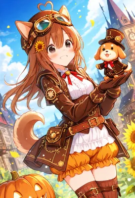 (Dutch angle),upper body,Adventurer's Clothes,Leather gloves,((head on Blue-black puppy)),(Wear a Japanese sword)),(strong wind),ponytail,(black hair,red inner hair:1.2),blush , flower,blush,great joy,(Jewelry Accessories),grassland,smile,(Running),(A short cloak fluttering in the wind),smug face,