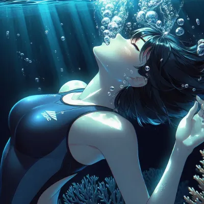 Anime-style image of a girl descent on the bottom of a deep pool, struggling to hold her breath, with her eyes closed. She is wearing a sleek competive sleeveless neon blue swimsuit, has short hair, and is sinking headfirst, completely upside down. Many air bubbles are escaping from her mouth, indicating she is struggling. The underwater scene is vibrant, illuminated by light patterns from the sun.Best Quality.