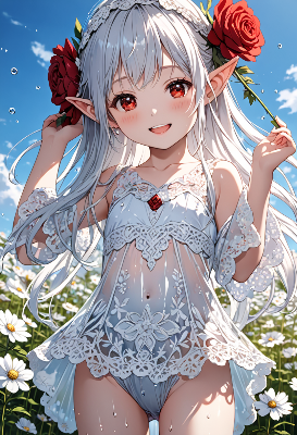 青空の下、花畑で遊ぶ白髪のエルフ少女。頭に咲く花冠が風に揺れ、赤い瞳が喜びに輝く。彼女の口元に覗く鋭い牙は、隠された秘密の証。森の守護者として、今日も冒険の旅に出る。陽光に照らされ、彼女の笑顔が周囲を明るく照らす瞬間。どんな出会いが待っているのか、想像が膨らむ。