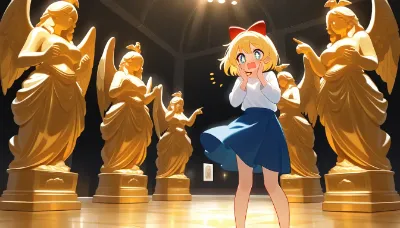 1girl, solo, (blonde hair:1.2), short hair, bob hair, (blue eyes:1.3), (hair bow:1.4), (red bow:1.4), large bow, calm expression, gentle smile, standing, looking at viewer, sunset background, (golden hour:1.3), (backlighting:1.4), (rim lighting:1.3), glowing hair, (golden glow:1.3), silhouette lighting, wind, (hair flowing:1.2), skirt, (golden light on clothes:1.2), (shining ribbon:1.2), soft lighting, warm colors, orange sky, peaceful atmosphere, beautiful detailed sky, lens flare, an extremely delicate and beautiful, anime style, (masterpiece:1.3), (best quality:1.3), (very aesthetic:1.2), (absurdres:1.2)