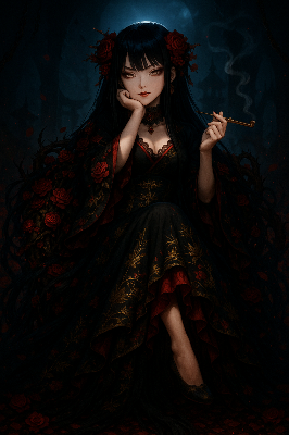 暗闇に包まれた森の奥深く、棘の冠を戴いた金髪の女王が優雅に座す。赤い薔薇が彼女のドレスを彩り、落ちる花弁が血のように地面を染める。彼女は禁断の秘密を抱え、訪れる冒険者を甘い視線で誘惑する。果たして、この薔薇園は永遠の楽園か、それとも罠に満ちた迷宮か? 彼女の微笑みが語る物語に、誰もが心を奪われる。