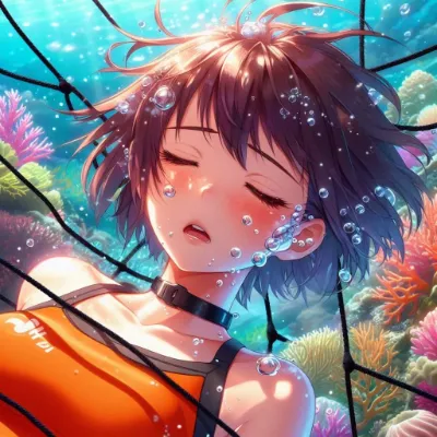 Detailed anime-style image of a girl of Asian descent unable to hold her breath while swimming at the bottom of the Coral Sea. She is wearing a sleek competitive sleeveless dark blue swimsuit and has short, flowing black hair. She appears to be struggling underwater, with many bubbles escaping from her mouth. The underwater scene is filled with vibrant light patterns from the sun, colorful fish. She closes eyes. She is caught by giant octopus and completely upside down.