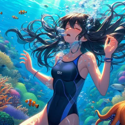 Detailed anime-style image of a girl of Asian descent unable to hold her breath while swimming at the bottom of the Coral Sea. She is wearing a sleek competitive sleeveless dark blue swimsuit and has short, flowing black hair. She appears to be struggling underwater, with many bubbles escaping from her mouth. The underwater scene is filled with vibrant light patterns from the sun, colorful fish. She closes eyes. She is caught by giant octopus and completely upside down.