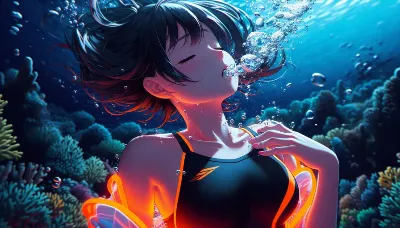 Anime-style image of a girl descent at the bottom of a deep pool, struggling to hold her breath, with her eyes closed. She is wearing a sleek competive sleeveless swimsuit, has short hair, and is sinking headfirst, completely upside down. Few bubbles are escaping from her mouth, indicating she is exhaling or struggling. The underwater scene is vibrant, illuminated by light patterns from the sun, with colorful fish and aquatic plants surrounding her. Best Quality.
