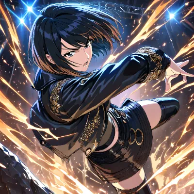 masterpiece, best quality, ultra-detailed, high resolution, 4k, vivid anime style, a slender Japanese female idol (1.2), black bob-cut hair, black eyes, vibrant orange stage outfit (1.1), short pleated skirt with white frills, fitted crop top with star emblem, orange knee-high boots, energetic performance, confident pose, cheerful smile (1.1), brightly lit stage, glowing neon lights in background, enthusiastic audience waving glow sticks, sparkling microphone under stage lights, dynamic composition, cinematic lighting, highly detailed facial features, sharp focus, vibrant colors