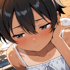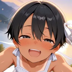 1girl, little girl, black hair, very short hair (1.2), hair between eyes (1.4), parted bangs (0.8), black eyes, tareme, tanlines,