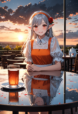 8K resolution,((cinematiclight,masterpiece,best quality,Ultra extremely detail everyone ,perfect anatomy,high-resolution,highres,extremely detailed,sharp focus)),((high-contrast:1.6,strong down-light, flower print)) ,((extreme from_below:1.5, zoom-up leg,cute child elf wearing outfit orange maid-suit with sheer fabric, embroidered with white vine-like lace, with sleeves and brilliant sequins, white unserwear,with big white brooch,orange gown),((best detailed red Eyes reflection)), (messy platinum-white long hair),elf ear with big red earrings ,wetting face,tilt,cheek,blush,enough lip with lipstick and wet,Skin Gloss and skin is soaking wet, wet-lip:1.5,big hip,small breasts,Skin Gloss at legs,looking at viewer,smile,mouth wide open,wearing head band of rose, raise foot toward viewer,standing on table,BREAK,((cat)),warm evening light, soft breeze,dark clouds in sunset, Bubbles, maple trees, <lora:hohoaka:1> <lora:make25d_type1_v100:1>