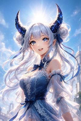 夜の古寺で、銀色の長い髪をなびかせた少女が刀を携え、静かに佇む。彼女は寺院の守護者として、闇に潜む影を待ち受ける。青い花の髪飾りが月光に輝き、遠くのランタンが幻想的な光を投げかける。果たして今宵、どんな冒険が彼女を待つのか? 風が囁く中、少女の青い瞳が決意を宿す瞬間。