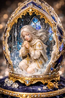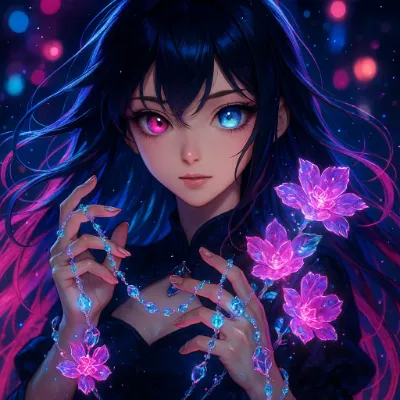 淡いピンクの花びらが舞う夕暮れの庭で、少女は静かにネックレスを手に取る。長いピンクの髪に飾られた花飾りが、風に揺れながら過去の思い出を呼び起こす。彼女は失われた恋人との約束を胸に、優しい視線で未来を見つめる。この瞬間、桜の精霊が彼女に囁きかけるように、世界が優しく輝き出す。読み手は、彼女の心に秘められた物語を想像せずにはいられない。
