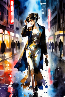 雨の降りしきる夜の街路で、ダークブルーのスーツに身を包んだ女性が静かに歩む。街灯の柔らかな光が水溜まりに反射し、彼女の足元を幻想的に照らす。過去の秘密を抱え、彼女は次のミッションへと向かうのだろうか。雨音が彼女の心のさざめきを隠し、街の喧騒の中で一瞬の静寂を生む。この瞬間、彼女の冒険が始まる予感がする。