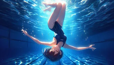 Anime-style image of a girl descent on the bottom of a deep pool, floating weekly, with her eyes closed. She is wearing a sleek competive sleeveless silver swimsuit, has short hair, and is sinking headfirst, completely upside down. Small air bubbles are escaping from her mouth, indicating she is exhaling or struggling. The underwater scene is vibrant, illuminated by light patterns from the sun.Best Quality.