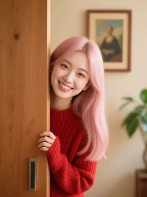 この作品は、まるで日常のワンシーンを切り取ったかのような「つまみ食いが見つかった瞬間」をテーマにしています。肩までまっすぐに流れる淡いピンク色の髪は、光の加減によって柔らかく輝き、彼女の表情にほんのりとした可憐さを添えています。スカイブルーのワンピースは、丸いネックラインによって優しい印象を強調し、ゆったりとした布の落ち感が自然な生活感を演出しています。 右手を口元に添えた仕草は、まさに「見つかっちゃった!」という瞬間を象徴しており、微笑みを半ば隠すことで、観る者に「彼女は何をつまみ食いしたのだろう?」と想像を膨らませる余地を残しています。背景のベージュのソファや白いクッション、緑の鉢植え、木製のサイドテーブル、額縁の絵、そしてクリーム色のカーテンまで、細部にわたって丁寧に配置することで、室内の温かみとリアリティを高めました。 技術的には、髪色の淡いピンクを自然光に馴染ませるために繊細なトーン調整を行い、肌の質感は柔らかさと透明感を両立させています。さらに、衣服の布地の質感や背景の木材の温もりをリアルに描き出すことで、フォトスタイルらしい「そこに彼女が本当に座っている」ような臨場感を追求しました。観る人が思わず微笑んでしまうような、日常の小さなドラマを切り取った一枚です。 --- This work, themed on the "moment when someone discovers she's been caught snacking," feels as if it were a snapshot of an everyday scene. Her pale pink hair, flowing straight down to her shoulders, shimmers softly in the light, adding a touch of delicate charm to her expression. The oversized sky blue dress's round neckline emphasizes a gentle impression, while the loose, flowing fabric creates a natural, everyday feel. Her right hand over her mouth symbolizes the exact moment she's been discovered, and her half-hidden smile leaves room for the viewer to imagine what she's been snacking on. Carefully arranged details in the background, such as the beige sofa, white cushions, green potted plants, wooden side table, framed picture, and cream-colored curtains, enhance the warmth and realism of the interior. Technically, delicate toning was used to blend the pale pink of her hair with the natural light, while her skin texture is both soft and translucent. Furthermore, by realistically depicting the texture of the fabric of the clothing and the warmth of the wood in the background, we pursued the sense of realism that is characteristic of Photo Style, making it seem as if "she is really sitting there." It is a photo that captures the small dramas of everyday life that will make the viewer smile unintentionally.