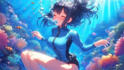 Detailed anime-style image of a girl of Asian descent unable to hold her breath while sinking headfirst to the bottom of the Coral Sea in night. She is wearing a sleek competitive sleeveless neon red swimsuit and has middle-short, flowing black hair with high ponytail. She appears to be exhaling or struggling underwater, with many air bubbles escaping from her mouth. She closes eyes. She is sleeping on her back.
