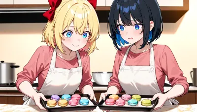 1girl,solo,(blonde hair:1.2),blue eyes,(hair bow:1.5),(red bow:1.4),(large bow:1.1),short hair,bob hair,(cafe uniform:1.4),(cafe waitress:1.3),(lace apron:1.4),(white apron:1.3),black dress,short sleeve dress,cafe style outfit,frills,(holding tray:1.4),(macaron tray:1.4),(colorful macarons:1.5),(macarons on tray:1.4),pink macarons,blue macarons,yellow macarons,purple macarons,green macarons,pastel macarons,(hand on hip:1.3),(one hand on waist:1.3),confident pose,(cute smile:1.3),(cheerful expression:1.3),(recommending gesture:1.2),this is recommended expression,sparkling eyes,friendly face,cafe interior,cafe counter,pastry display,wooden counter,warm lighting,cozy atmosphere,afternoon cafe scene,standing position,facing viewer,upper body focus,professional waitress pose,an extremely delicate and beautiful,beautiful detailed eyes,beautiful detailed face,delicate fingers,sweet atmosphere,inviting mood,(masterpiece:1.3),(best quality:1.3),(very aesthetic:1.2),(absurdres:1.2),