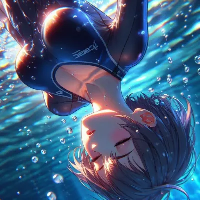 Detailed anime-style image of a girl of Asian descent unable to hold her breath while swimming at the bottom of the Coral Sea in night. She is wearing a sleek competitive sleeveless navy blue swimsuit and has middle-short, flowing black hair with high ponytail. She appears to be exhaling or struggling underwater, with many air bubbles escaping from her mouth. She closes eyes. She is completely upside down. Best Quality.