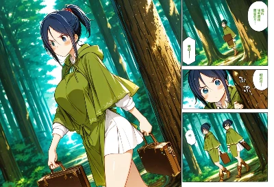 (best quarity:1.5, ultra high resolution, 8K, masterpiece), (shiny skin, extremely detailed, perfect anatomy, very aesthetic), (comic, speech bubble, frame, focus line, comic expression, sound effect), (2 girls, multiple girl:1.4), large breast, large eyes:1.2, (1 girl, gold eyes, light green hair, hair between eyes, low-braided long hair, green tunic, brown gloves, brown fur boots, brown belt, utility belt, leather armor, dagger, sheath, brown hooded cloak), BREAK, (1 girl, toddler, chibi:1.2, red hair, short hair, brown bear ears, yellow eyes, over-sized pink parka:1.2, white cat on head), BREAK, (2 girls, walking maze, get lost, looking around, trouble, green wall around), (blush, labyrinth, dungeon, indoor, fantasy world), dutch angle, (super fine illustration, photorealistic, depth of field:0.4), <lora:hairdetailer:0.8>