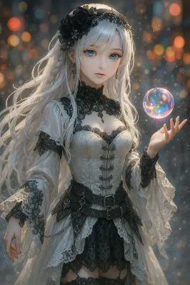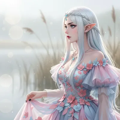 霧に包まれた湖畔で、銀髪のエルフ姫が静かに佇む。青い宝石の冠が朝霧に輝き、優雅なドレスが風に揺れる。彼女は古の約束を思い出し、手に持ったピンクの布を優しく握りしめる。遠くから聞こえる水のささやきが、失われた恋人の帰りを予感させる。姫の瞳には、永遠の森の秘密が宿り、訪れる冒険者を誘うかのように。この瞬間、ファンタジーの世界が息づく。