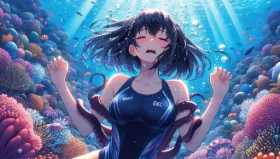 A close-up anime-style image of a girl of Asian descent lying on the sea floor next to a coral reef. She appears unable to hold her breath, with her eyes closed and small bubbles escaping from her slightly parted lips. Her long hair styled in a ponytail, floats around her. She wears a sleek neckhold sleeveless neon blue swimsuit with front zipper. The vibrant underwater environment includes colorful coral reefs and dappled light patterns reflecting off her skin. Best Quality.