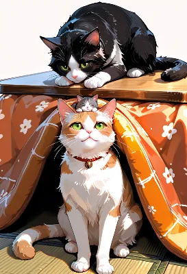畳の部屋で、オレンジの布を隠れ家に仕立てた三毛猫が、好奇心いっぱいの目で外を覗いている。そこへ黒猫が上から悠々と乗っかり、まるで守護者のように見張る。ふたりは今日も秘密の遊びを繰り広げ、部屋中に小さな冒険の予感が広がる。どんなお宝が隠されているのか、想像が膨らむ日常のひとコマ。
