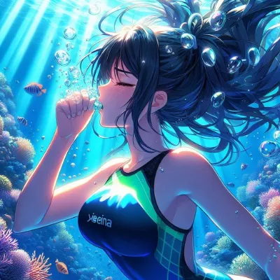 A close-up anime-style image of a girl of Asian descent lying on the sea floor next to a coral reef. She appears unable to hold her breath, with her eyes closed and small bubbles escaping from her slightly parted lips. Her long hair styled in a ponytail, floats around her. She wears a sleek neckhold sleeveless neon blue swimsuit with front zipper. The vibrant underwater environment includes colorful coral reefs and dappled light patterns reflecting off her skin. Best Quality.