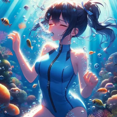A close-up anime-style image of a girl of Asian descent lying on the sea floor next to a coral reef. She appears unable to hold her breath, with her eyes closed and small bubbles escaping from her slightly parted lips. Her long hair, styled in a ponytail, floats around her. She wears a simple two-piece metallic rainbow swimsuit. The vibrant underwater environment includes colorful coral reefs and dappled light patterns reflecting off her skin. Best Quality.