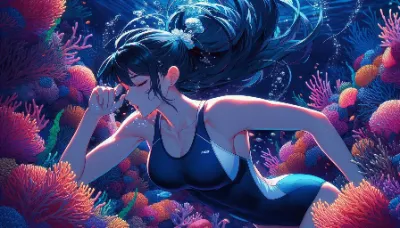 A close-up anime-style image of a girl of Asian descent lying on the sea floor next to a coral reef. She appears unable to hold her breath, with her eyes closed and small bubbles escaping from her slightly parted lips. Her long hair styled in a ponytail, floats around her. She wears a sleek neckhold sleeveless neon blue swimsuit with front zipper. The vibrant underwater environment includes colorful coral reefs and dappled light patterns reflecting off her skin. Best Quality.