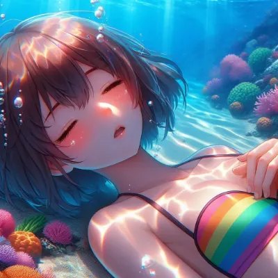 A close-up anime-style image of a girl of Asian descent lying on the sea floor next to a coral reef. She appears unable to hold her breath, with her eyes closed and small bubbles escaping from her slightly parted lips. Her long hair styled in a ponytail, floats around her. She wears a sleek neckhold sleeveless neon pink swimsuit with front zipper. The vibrant underwater environment includes colorful coral reefs and dappled light patterns reflecting off her skin. Best Quality.