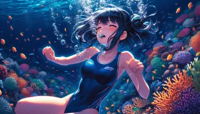 Anime detailed style image of a girl, fully submerged underwater, swimming upwards towards the sea surface. She is wearing a colorful swimsuit, looking youthful and energetic, with her long hair flowing behind her in the water. The perspective includes a boat floating above on the sea surface. The underwater environment is vibrant and colorful, filled with marine life like fish and corals, creating a lively and beautiful underwater scene. Best Quality.