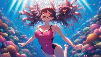 Detailed anime-style image of a girl of Asian descent unable to hold her breath while swimming at the bottom of the Coral Sea. She is wearing a sleek competitive sleeveless pink swimsuit and has flowing hair with high ponytail. She appears to be exhaling or struggling underwater, with many bubbles escaping from her mouth. The underwater scene is filled with vibrant light patterns from the sun, colorful fish. She closes eyes.She is completely upside down Best Quality