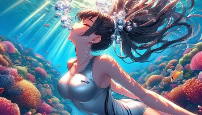Detailed anime-style image of a girl of Asian descent unable to hold her breath while swimming at the bottom of the Coral Sea. She is wearing a simple sleeveless sporty two-piece blue swimsuit and has flowing hair with high ponytail. She appears to be exhaling or struggling underwater, with many bubbles escaping from her mouth. The underwater scene is filled with vibrant light patterns from the sun, colorful fish. She closes eyes.She is completely upside down Best Quality