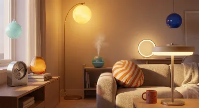 A pastel minimal illustration of an open eyeshadow palette. From the colorful powder pans, swirls of sparkling dust rise upwards. The dust particles are visually coalescing and solidifying into butterfly wings.