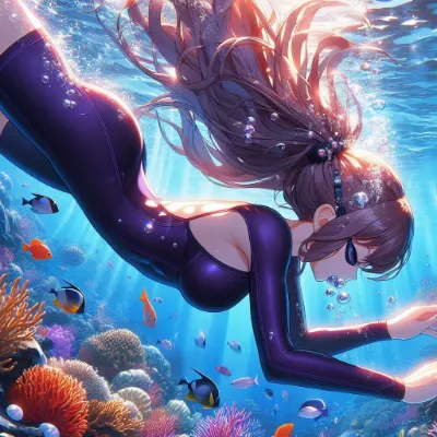 Detailed anime-style image of a girl of Asian descent unable to hold her breath while swimming at the bottom of the Coral Sea. She is wearing a simple two-piece metallic blue swimsuit and has flowing hair with high ponytail. She appears to be exhaling or struggling underwater, with many bubbles escaping from her mouth. The underwater scene is filled with vibrant light patterns from the sun, colorful fish. She closes eyes.She is completely upside down Best Quality
