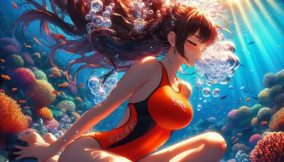 Detailed anime-style image of a girl of Asian descent unable to hold her breath while swimming at the bottom of the Coral Sea. She is wearing a sleek competitive sleeveless two-piece blue swimsuit and has flowing hair with high ponytail. She appears to be exhaling or struggling underwater, with many bubbles escaping from her mouth. The underwater scene is filled with vibrant light patterns from the sun, colorful fish. She closes eyes.She is completely upside down Best Quality