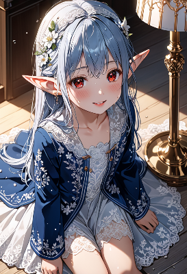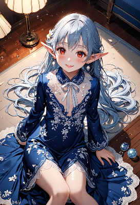 8K resolution,(cinematiclight,masterpiece,best quality,Ultra extremely detail everyone ,perfect anatomy,high-resolution,highres,extremely detailed,sharp focus),((high-contrast:1.6,strong down-light, flower print)) ,((extreme from_above:1.5,cute child elf wearing outfit Deep blue-suit with sheer fabric,embroidered with white vine-like lace, with sleeves and brilliant sequins, white unserwear, Deep blue gown),((best detailed red Eyes reflection)), (messy platinum-white long hair colored inner hair),elf ear with big red earrings ,wetting face,tilt,cheek,blush,enough lip with lipstick and wet,Skin Gloss and skin is soaking wet, wet-lip:1.5,big hip,small breasts,Skin Gloss at legs,smile,mouth wide open, BREAK, (((big dice set, on the Kotatsu)) ,warm evening light, soft breeze,Bubbles, maple trees, <lora:hohoaka:1> <lora:make25d_type1_v100:1>