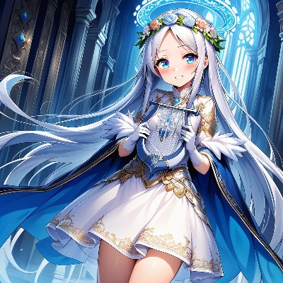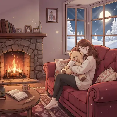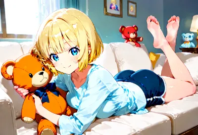 青い髪の少女が、愛らしいくまのぬいぐるみを抱きしめてベッドに横たわる。部屋はぬいぐるみたちでいっぱいで、窓から差し込む優しい月明かりが彼女を包む。きっと今夜も、くまさんと一緒に夢の冒険へ出発するのだろう。そこでは雲の上の気球が待っていて、甘いお菓子や不思議な出会いが満載。少女の穏やかな寝顔が、そんな心温まる物語を予感させる。