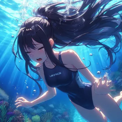 An anime-style image of a girl unable to hold her breath while swimming at the bottom of the Coral Sea, viewed from below. She wears a sleek competitive orange swimsuit and has flowing black hair in a high ponytail. She appears to be exhaling or struggling underwater, with air bubbles escaping from her mouth. The underwater scene is filled with vibrant light patterns from the sun and aquatic plants. Her hands are on her mouth. She closes eyes. She is completely upside down