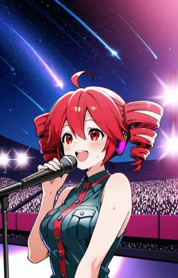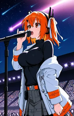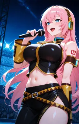 1girl,vocaloid,gumi,athlete body,large breasts,Singing passionately,sweat,outdoors, on stage,lightimg,steel frame, audience, crowd,starry sky, city night view in the background,