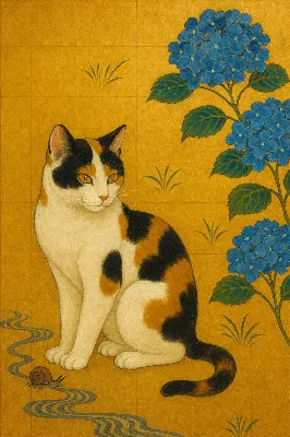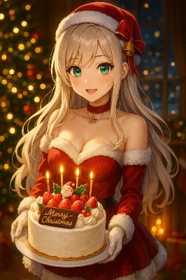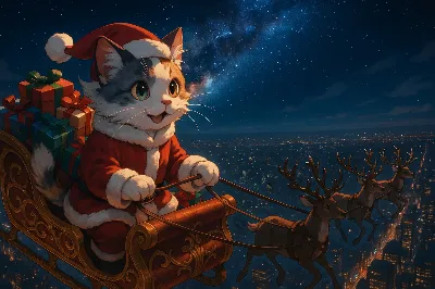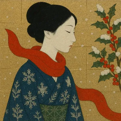 雪が静かに降り積もる冬の庭で、白い猫が赤い傘を差し、首にホリーの葉と小さなベルを飾って座っている。彼女は森の精霊のように、クリスマスの贈り物を運ぶ使者なのかもしれない。傘の上に積もった雪が、穏やかな冒険の始まりを予感させる。遠くから聞こえるベルの音が、魔法のような瞬間を紡ぎ出す。