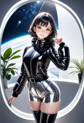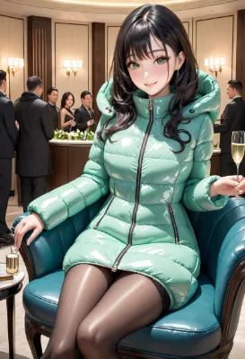 (photorealistic:1.4), (RAW photo), masterpiece, best quality, extremely detailed, lady, neat and clean, elegant, polite, (shy:0.9), black wavy hair long bob cut, almond eyes, (smile:0.9), slim fit, full sleeves, high necked, (closed zipper:0.9), rubber, latex, (black puffer down bodysuit:1.2), BREAK, (sleeveless metal breastplate, high-cut metal shorts), patent leather long gloves, platform knee-high boots, standing pose, (high angle shot:0.6), stylish exposed concrete wall in the background