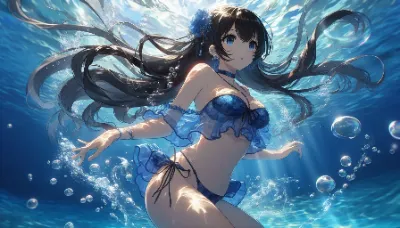Detailed anime-style image of a girl of Asian descent unable to hold her breath while swimming at the bottom of the Coral Sea in night. She is wearing a sleek competitive sleeveless vivid blue swimsuit and has short, flowing black hair with high ponytail. She appears to be exhaling or struggling underwater, with many air bubbles escaping from her mouth. She closes eyes. She is completely upside down. Best Quality.