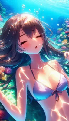 Detailed anime-style illustration of a serene, sleeping young girl submerged in a coral reef cave, illuminated by sunlight creating a sparkling effect. She has long, wavy hair floating around her and is wearing a sleek, competitive orange swimsuit. Her limbs are relaxed, surrounded by bubbles as she floats. Emphasize bubbles rising from her mouth to the surface of the water, creating an ethereal atmosphere.Best Quality.