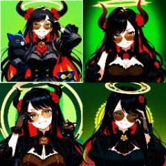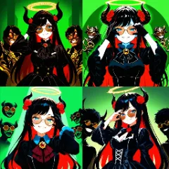 anime style, masterpiece, best quality, extremely detailed, high resolution, high quality,1girl, bust shot,beautiful woman, (18 Years Old: 1.1), 7-heads tall, Devil, devils horns,pretty woman, (longhair), blue eyes,(round eyewear:1.6),(brown-tinted eyewear:1.9),(hand on eyewea:1.9), beautiful breasts,(black hair,red inner hair:1.2),swept bangs,Black dress, wide ruffle sleeves, black gloves,Magic Circle halo,Rose Brooch, Frills, Rose hair ornament,((golden decoration)), blush, grin, smug face, (head on blue and black color puppy:1.9),BREAK, green background